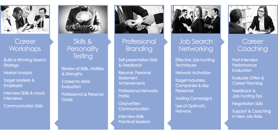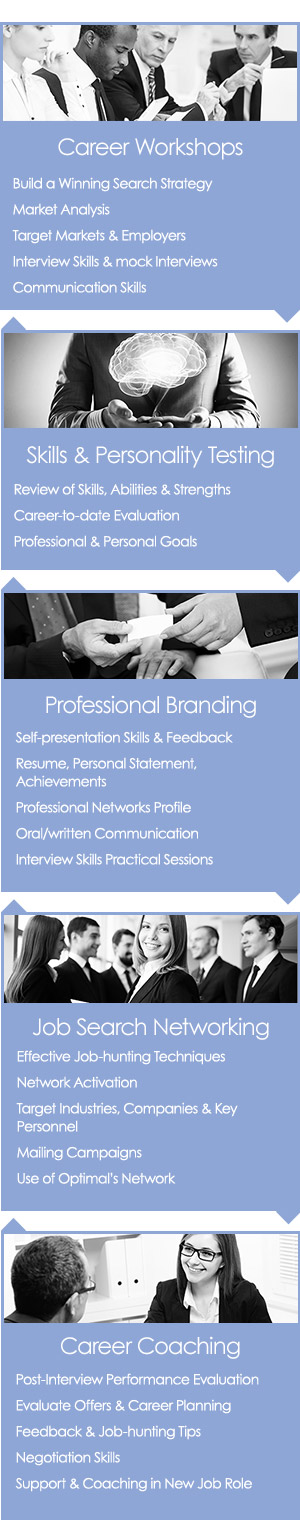 At Optimal we work closely with our clients and directly with individuals, to develop a strategic and methodical approach for effectively managing a Career Transition. It is a personalized service which includes coaching and assessment, proven to be beneficial in the effectiveness of our outplacement programs.